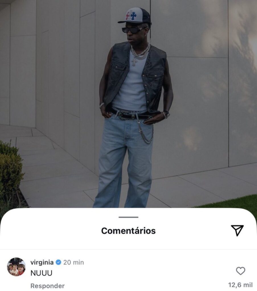 Virginia Fonseca, de 26 anos, causou burburinho ao interagir com novas fotos de Vini Jr, de 25, postadas nesta quinta-feira (25). Nas imagens, o jogador surge com várias correntes e óculos de marca de luxo, com a legenda “Um pouco de flow e Prada”. Entre os inúmeros elogios ao clique, Virginia deixou seu comentário: “NUUU”, numa reação aparentemente impressionada.