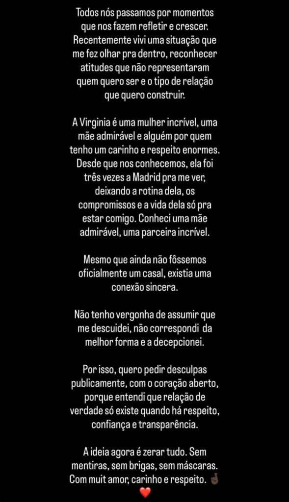No desfecho da nota, ele pediu perdão de forma direta e defendeu que só existe relacionamento verdadeiro quando há respeito, confiança e transparência. “Quero pedir desculpas publicamente, com o coração aberto. A ideia agora é zerar tudo. Sem mentiras, sem brigas, sem máscaras. Com muito amor, carinho e respeito”, concluiu.